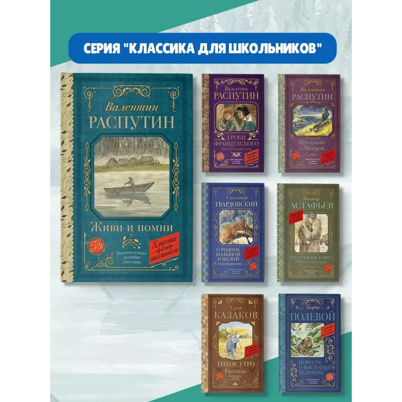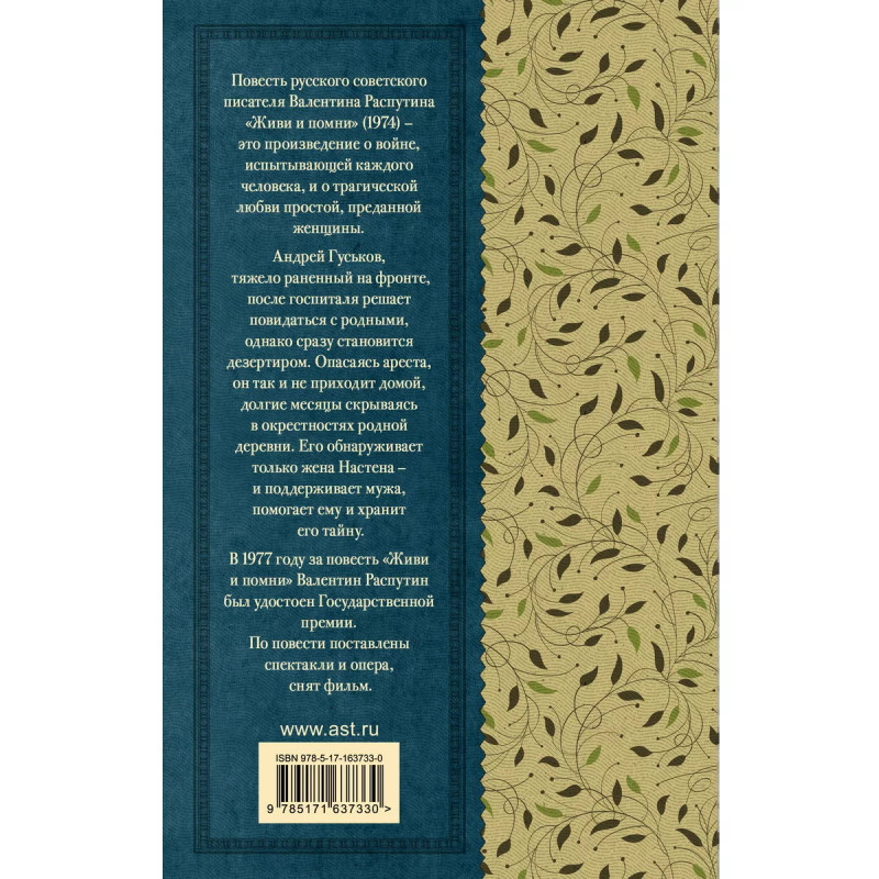 Повесть русского советского писателя Валентина Распутина "Живи и помни" (1974) это произведение о войне, испытывающей каждого человека, и о трагической любви простой, преданной женщины. Андрей Гуськов, тяжело раненный на фронте, после госпиталя решает повидаться с родными, однако сразу становится дезертиром. Опасаясь ареста, он так и не приходит домой, долгие месяцы скрываясь в окрестностях родной деревни. Его обнаруживает только жена Настена и поддерживает мужа, помогает ему и хранит его тайну. В 1977 году за повесть "Живи и помни" Валентин Распутин был удостоен Государственной премии. По повести поставлены спектакли и опера, снят фильм.