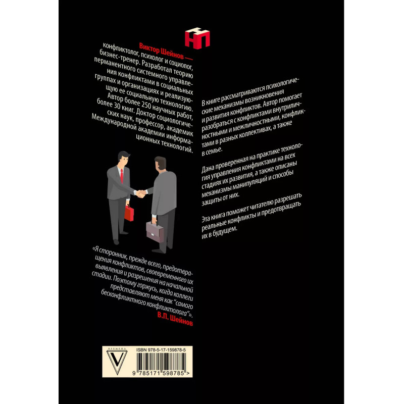 Виктор Шейнов конфликтолог, психолог и социолог, бизнес-тренер. Разработал теорию перманентного системного управления конфликтами в социальных группах и организациях и реализующую ее социальную технологию. Автор более 250 научных работ, более 30 книг. Доктор социологических наук, профессор, академик Международной академии информационных технологий. Каждый из нас периодически в жизни сталкивается с конфликтами на работе или в семейной жизни, и иногда с собой. В книге "Управление конфликтами" рассматриваются психологические механизмы возникновения и развития конфликтов. Автор помогает разобраться с конфликтами внутриличностными и межличностными, конфликтами в разных коллективах, а также в семье. Дана проверенная на практике технология управления конфликтами на всех стадиях их развития, а также описаны механизмы манипуляций и способы защиты от них. Эта книга поможет читателю разрешать реальные конфликты и предотвращать их в будущем.