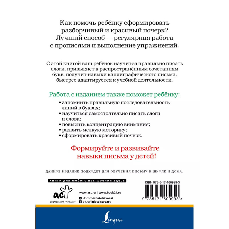 Научить ребёнка писать разборчиво и красиво задача не из лёгких, но она вполне под силу заботливым родителям и учителям. С этим тренажёром младшие школьники освоят способы соединения букв, которые образуют слоги, и закрепят навык разборчивого письма, тренируясь писать слова. Прописи соответствуют требованиям ФГОС (Федерального государственного образовательного стандарта) и подходят к любым учебникам русского языка. Издание удобного формата предназначено для учащихся начальной школы, их родителей и учителей.