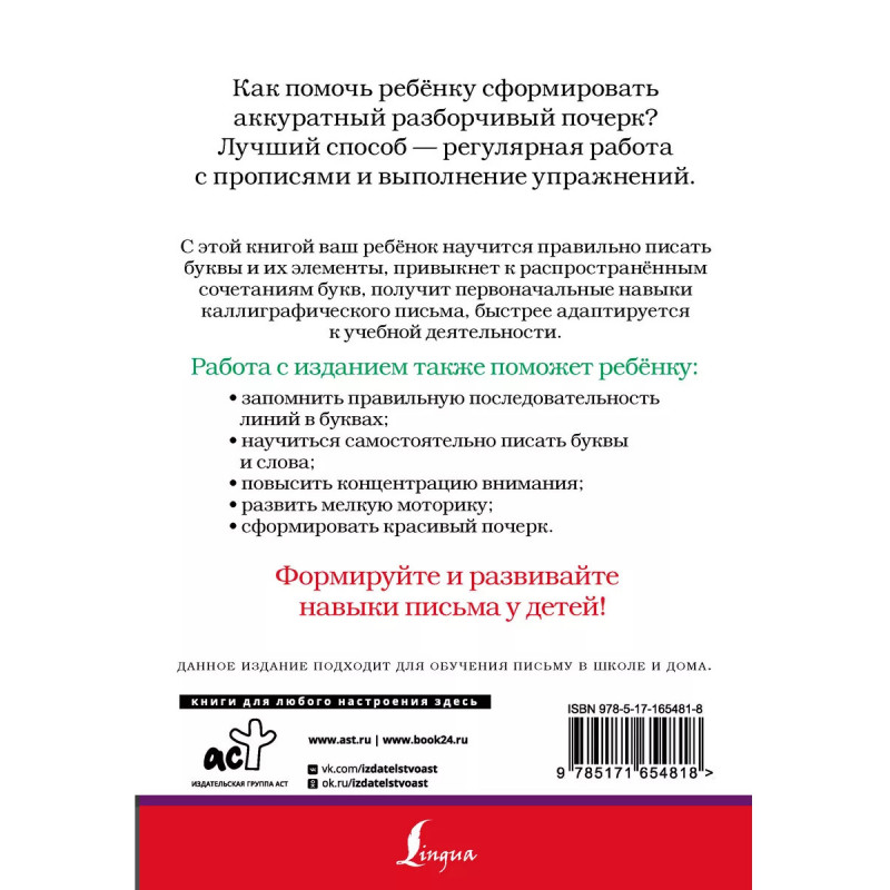 Научите ребёнка писать красиво и помогите ему сформировать аккуратный почерк с помощью регулярной работы с данными прописями. Издание включает палочки, крючки, плавные и кривые линии, буквы русского алфавита со стрелками, показывающими направление линий, а также сочетания букв, слова и предложения. Выполнение упражнений помогает формировать и отрабатывать навыки разборчивого, красивого, быстрого письма. Работа с прописями положительно влияет и на память, и на внимание младшего школьника, а также на его общее развитие. Прописи соответствуют требованиям ФГОС (Федерального государственного образовательного стандарта) и подходят к любым учебникам русского языка. Издание удобного формата предназначено для учащихся начальной школы, учителей и родителей, а также может быть полезно при подготовке детей к школе.