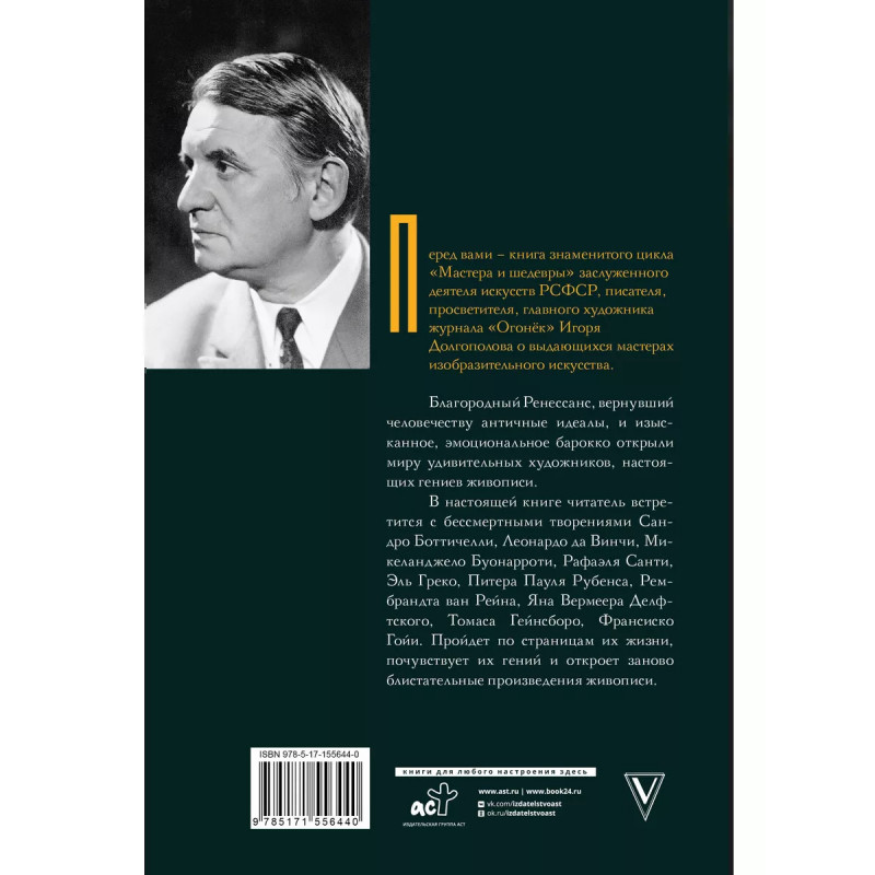 Перед вами книга знаменитого цикла "Мастера и шедевры" заслуженного деятеля искусств РСФСР, писателя, просветителя, главного художника журнала "Огонёк" Игоря Долгополова о выдающихся мастерах изобразительного искусства. Благородный Ренессанс, вернувший человечеству античные идеалы, и изысканное, эмоциональное барокко открыли миру удивительных художников, настоящих гениев живописи. В настоящей книге читатель встретится с бессмертными творениями Сандро Боттичелли, Леонардо да Винчи, Микеланджело Буонарроти, Рафаэля Санти, Эль Греко, Питера Пауля Рубенса, Рембрандта ван Рейна, Яна Вермеера Делфтского, Томаса Гейнсборо, Франсиско Гойи. Пройдет по страницам их жизни, почувствует их гений и откроет заново блистательные произведения живописи.