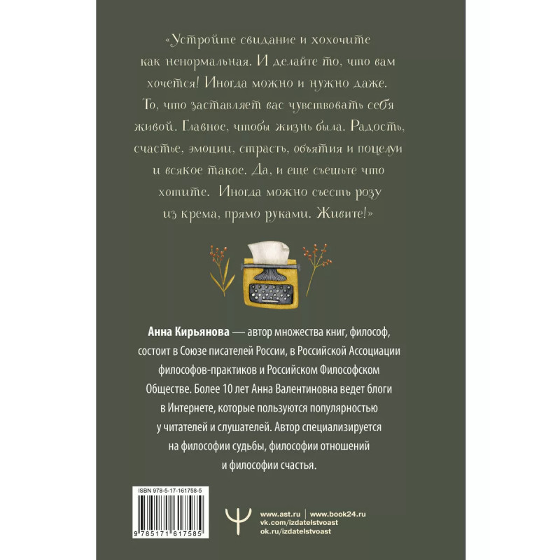 Как израненной душе найти счастье? Прежде всего, не бояться любить! Писатель-философ Анна Валентиновна Кирьянова поможет вам разобраться в ваших чувствах, чтобы вы смогли жить счастливо и построить гармоничные отношения. Авторские мысли облекаются в философские притчи, в глубине которых скрывается драгоценная мудрость. Автор книги предлагает читателям непривычный взгляд на их насущные проблемы и вопросы. В чем истинные причины одиночества? Можем ли мы требовать любви, если сами еще не научились ее дарить? Вместе с Анной Валентиновной вы сможете понять глубинные причины жизненных неурядиц для того, чтобы их преодолеть. Книга станет вашим добрым другом и советчиком в самых непростых вопросах о душе.