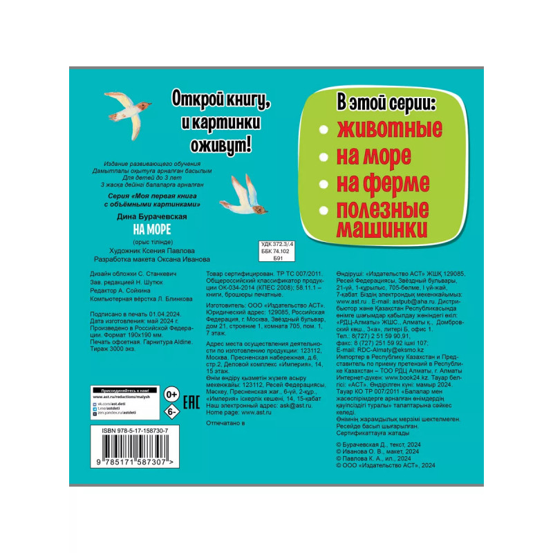 Кто живет в морях и океанах? Конечно, яркие рыбки, умные дельфины и осторожные крабы. Все они - и многие другие герои - так спешат познакомиться с малышом и рассказать о себе, что выпрыгивают со страниц этой книги! Красочные иллюстрации и объемные бумажные конструкции превращают книгу в полноценную игрушку, которая станет настоящим другом для ребенка, расскажет ему об окружающем мире, поможет развить мелкую моторику и образное мышление. Облегчить восприятие и запоминание новой информации помогут веселые стихи Дины Бурачевской. Откройте книгу и ее герои оживут!