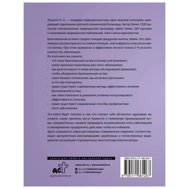 В книге в доступной форме изложены все основные вопросы, связанные с одним из самых массовых заболеваний человечества бронхиальной астмой. Читатель узнает, что такое бронхиальная астма и почему она возникает; как диагностируют это заболевание; какие бывают осложнения и как их можно распознать; какие существуют современные методы профилактики и лечения бронхиальной астмы; как самостоятельно контролировать эффективность лечения. Здесь содержатся самые достоверные и современные сведения, соответствующие авторитетным рекомендациям зарубежных и отечественных медицинских ассоциаций и проверенные многолетним опытом автора. Для широкого круга читателей.