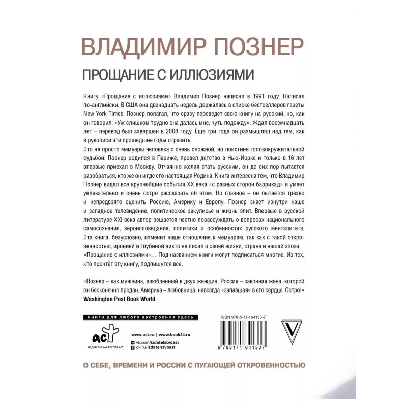Книгу "Прощание с иллюзиями" Владимир Познер написал двадцать восемь лет тому назад. Написал по-английски. В США она двенадцать недель держалась в списке бестселлеров газеты New York Times. Познер полагал, что сразу переведет свою книгу на русский, но, как он говорил: "Уж слишком трудно она далась мне, чуть подожду". Ждал долго перевод был завершен в 2008 году. Еще три года он размышлял над тем, как в рукописи эти прошедшие годы отразить. И только теперь, по мнению автора, пришло время издать русский вариант книги "Прощание с иллюзиями".