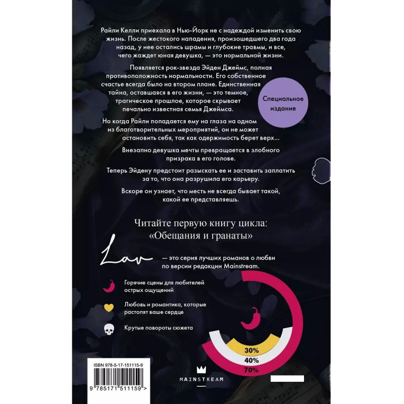 Райли Келли приехала в Нью-Йорк не с надеждой изменить свою жизнь. После жестокого нападения, произошедшего два года назад, у нее остались шрамы и глубокие травмы, и все, чего жаждет юная девушка, - это нормальной жизни. Появляется рок-звезда Эйден Джеймс, полная противоположность нормальности. Его счастье всегда было на втором плане. Единственная тайна, оставшаяся в его жизни, - это его темное, трагическое прошлое, которое скрывает его печально известная семья. Но когда Райли попадается ему на глаза на одном из благотворительных мероприятий, он не может остановить себя, так как одержимость берет верх.. Внезапно девушка его мечты превращается в злобного призрака в его голове. Теперь Эйдену предстоит разыскать ее и заставить заплатить за то, что она разрушила его карьеру. Вскоре он узнает, что месть не всегда бывает такой, какую представляешь.