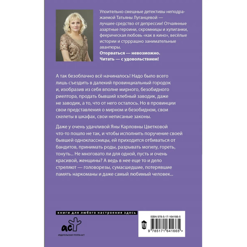 - Продолжение приключений авантюристки-стоматолога Яны Цветковой. - Находчивая главная героиня, умеющая найти выход из самых отчаянных ситуаций. - Лихо закрученный сюжет, искрометный юмор и рисковые герои секрет популярности детективов Татьяны Луганцевой. - От автора бестселлеров Белоснежка и семь трупов и Женщина-Цунами. Литературную деятельность автор успешно совмещает со стоматологической практикой, поэтому знает все нюансы профессии. - Серия Иронический детектив.