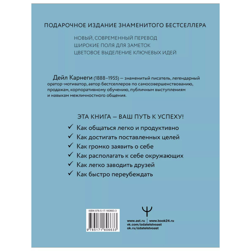 Это уникальное издание делает знакомство с важнейшей книгой нашего времени максимально удобным и увлекательным. Качественное подарочное издание в твердом переплете станет несомненным украшением любой библиотеки. Плотная белая бумага и большие удобные поля для заметок помогут не потерять нужную информацию. Специально выделенные цветом ключевые идеи позволят в любой момент освежить в памяти самое важное, не перечитывая книгу целиком. Обновленный впервые за более чем сорок лет вневременной бестселлер Дейла Карнеги классика, которая изменила и улучшила личную и профессиональную жизнь миллионов людей. Это новое издание самой влиятельной книги по самосовершенствованию, с бесценным материалом, восстановленным из оригинального текста 1936 года. Одно из самых известных мотивационных руководств в истории, проданное десятками миллионов экземпляров, переведенное почти на все известные письменные языки, оно помогло бесчисленному множеству людей добиться успеха.