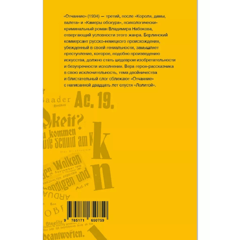 "Отчаяние" (1934) шестой роман Владимира Набокова, написанный в Берлине, и его третий, после "Короля, дамы, валета" и "Камеры обскура", психологически-криминальный роман, отвергающий условности этого жанра. Герман, берлинский коммерсант русско-немецкого происхождения, убежденный в своей гениальности, замышляет преступление, которое, подобно произведению искусства, должно стать шедевром изобретательности и безупречности исполнения. Жизнь, однако, оказывается намного остроумнее и художественней порочного замысла, кривое зеркало которого лишь искажает реальность. Форма повествования от первого лица, вера героя-рассказчика в собственную исключительность и блистательный слог сближают "Отчаяние" с написанной двадцать лет спустя "Лолитой".