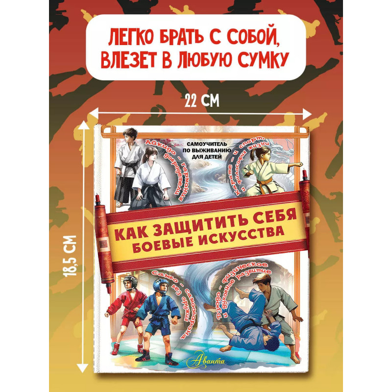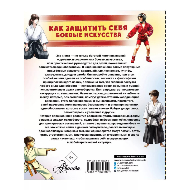 Это издание рассказывает о самых популярных видах боевых искусств: карате, айкидо, тхэквондо, кунг-фу, джиу-джитсу, дзюдо и самбо. Все стили представлены с подробным описанием истории их зарождения и развития, особый акцент сделан на особенностях, техниках и философских принципах каждого из них. Книга предлагает пошаговые инструкции по выполнению базовых техник, упражнений на гибкость и силу, которые, без сомнения, помогут детям улучшить свои физические данные, отточить координацию движений, стать более крепкими и выносливыми, а значит, способными защитить себя в нестандартной ситуации. При этом в издании подчеркивается важность безопасности и этики при занятиях единоборствами, которые воспитывают в юных бойцах дисциплину, самоконтроль и уважение к другим. Таким образом, данная книга не только богатый источник знаний о древних и современных боевых искусствах, но и практическое руководство для детей, желающих заниматься единоборствами. Для среднего школьного возраста.