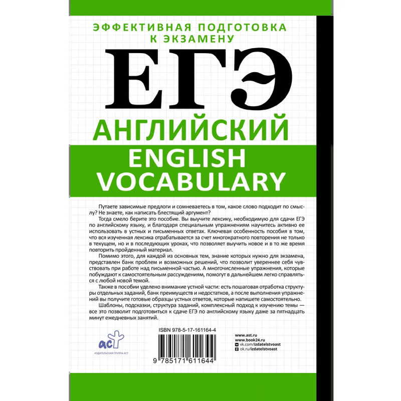 Путаете зависимые предлоги и сомневаетесь в том, какое слово подходит по смыслу? Не знаете, как написать блестящий аргумент?Тогда смело берите это пособие. Вы выучите лексику, необходимую для сдачи ЕГЭ по английскому языку, и благодаря специальным упражнениям научитесь активно ее использовать в устных и письменных ответах. Ключевая особенность пособия в том, что вся изученная лексика отрабатывается за счет многократного повторения не только в текущем, но и в последующих уроках, что позволяет выучить новое и в то же время повторить пройденный материал.