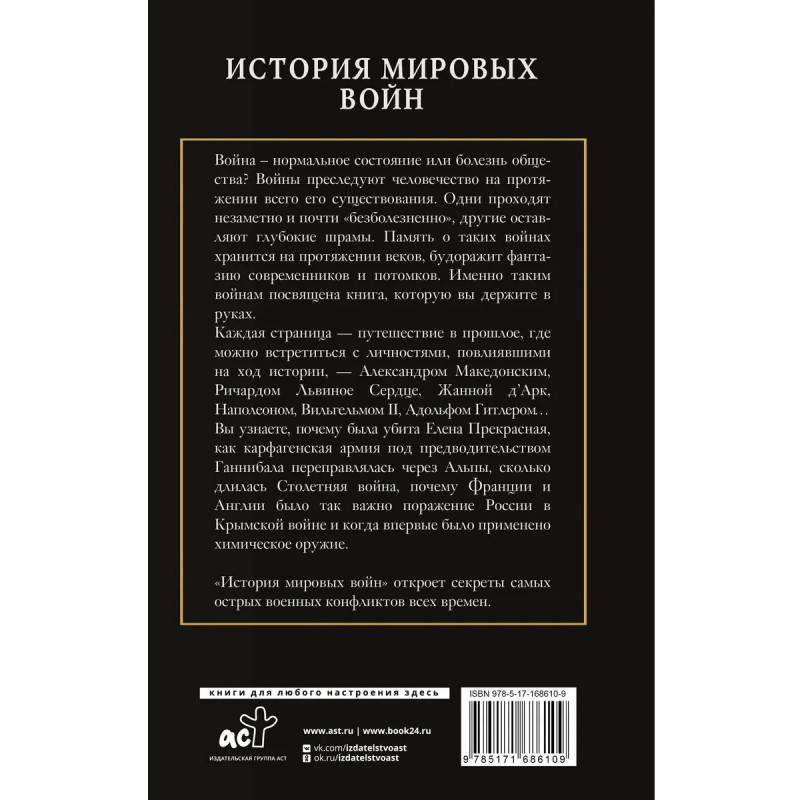 Война нормальное состояние или болезнь общества? И войны преследуют человечество на протяжении всего его существования. Одни проходят незаметно и почти "безболезненно", другие оставляют глубокие шрамы. Память о таких войнах хранится на протяжении веков, будоражит фантазию современников и потомков. Именно таким войнам посвящена книга, которую вы держите в руках. Каждая страница путешествие в прошлое, где можно встретиться с личностями, повлиявшими на ход истории, - Александром Македонским, Ричардом Львиное Сердце, Жанной ДАрк, Наполеоном, Вильгельмом II, Адольфом Гитлером Вы узнаете, почему была убита Елена Прекрасная, как карфагенская армия под предводительством Ганнибала переправлялась через Альпы, сколько длилась Столетняя война, почему Франции и Англии было так важно поражение России в Крымской войне и когда впервые было применено химическое оружие. "История мировых войн" откроет секреты самых острых военных конфликтов всех времен.