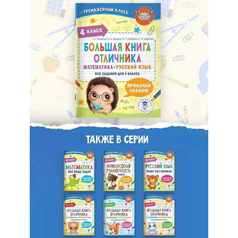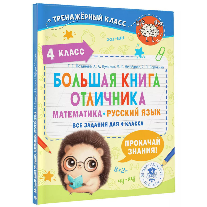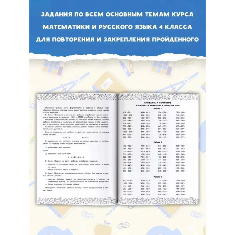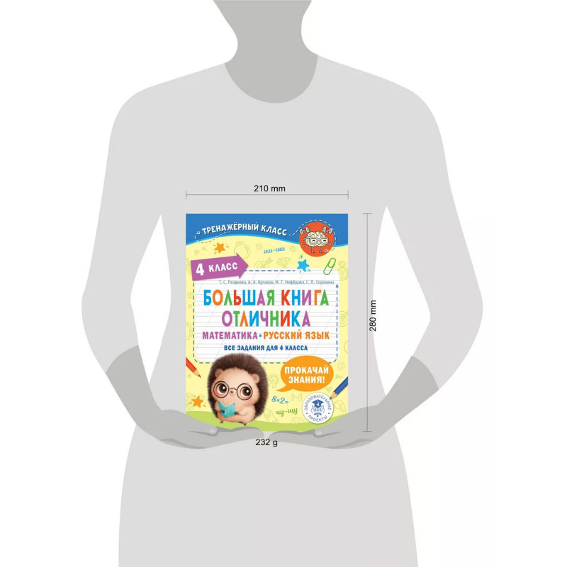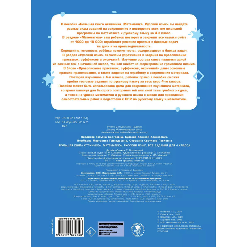 Большая книга отличника. Математика. Русский язык. Все задания для 4 класса. В пособии "Большая книга отличника. Математика. Русский язык" вы найдёте разные виды заданий на закрепление и повторение всех тем школьной программы по математике и русскому языку за 4-й класс. В разделе "Математика" ваш ребенок повторит и закрепит все навыки счёта от 1 до 1 ; отработает решение простых и базовых задач на доли и на производительность. Определить готовность ребёнка помогут тесты, содержащиеся в блоках задач. В раздел "Русский язык" включены упражнения и задания на правописание приставок, суффиксов и окончаний. Изучение состава слова является одной из важных тем в начальной школе, так как влияет на формирование грамотного письма. В блоке "Правописание приставок, суффиксов, окончаний" даны основные правила правописания, а также задания на отработку и закрепление материала. Повторяя изученное в 4-м классе, ребенок прямо в пособии сможет пройти тестовые задания по русскому языку за весь курс 4-го класса. Пособие может быть использовано дома для закрепления изученного материала, во время каникул дл