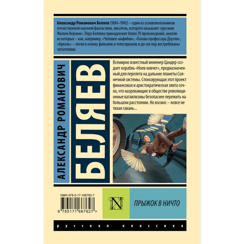 Автора знаменитых романов Человек-амфибия, Остров погибших кораблей и Голова профессора Доуэля Александра Беляева называют русским Жюлем Верном и Гербертом Уэллсом. За свою жизнь он написал свыше семидесяти произведений, которые заняли видное место в рядах классики советской фантастики. Многие его книги экранизированы, а идеи, высказанные в тех или иных произведениях, впоследствии были так или иначе воплощены в реальность. Прыжок в ничто относится к космической фантастике автора. Пусть и не настолько известная, как другие его произведения, книга оказала огромное влияние на все последующее развитие советской космической фантастики, а описанные в книге концепции и устройства впоследствии были развиты братьями Стругацкими, Георгием Мартыновым и другими советскими фантастами.