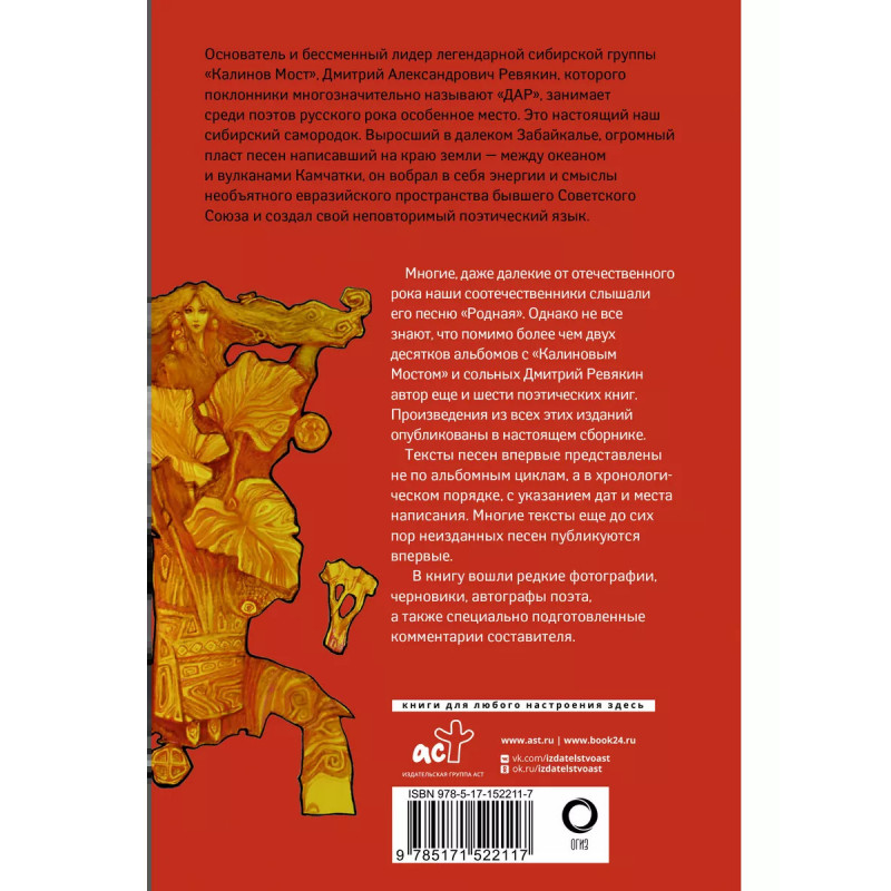 Калинов Мост. Избранные песни и стихи с комментариями. Лидер легендарной сибирской группы "Калинов Мост" Дмитрий Ревякин занимает среди поэтов русского рока особенное место. С формальной стороны это проявляется хотя бы в том, что его поэтические тексты, как заметили исследователи, далеко опережают всех остальных наших рокеров по лексическому разнообразию. Не в последнюю очередь тут сказалось увлечение Ревякина историей, а также поэзией реформатора русского языка Велимира Хлебникова. Дмитрий Александрович Ревякин, которого поклонники уважительно и с очевидным намеком называют "ДАР" - настоящий наш сибирский самородок. Выросший в далеком Забайкалье, огромный пласт песен написавший на краю земли - между океаном и вулканами Камчатки, он вобрал в себя энергии и смыслы необъятного евразийского пространства бывшего Советского Союза и создал свой неповторимый поэтический язык. Многие, даже далекие от отечественного рока наши соотечественники слышали его песню "Родная". Однако не все знают, что помимо более чем двух десятков альбомов с "Калиновым Мостом" и сольных, он еще