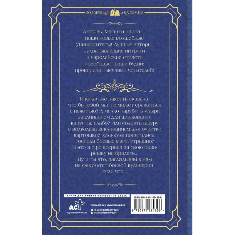 - От тандема талантливых писателей, авторов бестселлеров Рунета в жанре фэнтези. - Волшебная история, сдобренная колоритным одесским юмором, о сильной героине, исследующей новый мир колдовства и нежити и о нелегкой преподавательской доле. - Атмосфера магической академии: коварные студенты-конкуренты, коллеги, норовящие подставить, голодные волколаки. - Вдохновляющая история о том, как выжить и добиться признания, даже когда против тебя все и вся. - Серия Волшебная академия неподражаемая атмосфера студенческих будней в магических учебных заведениях всех мастей: от факультета чудовищ до школы вампиров.