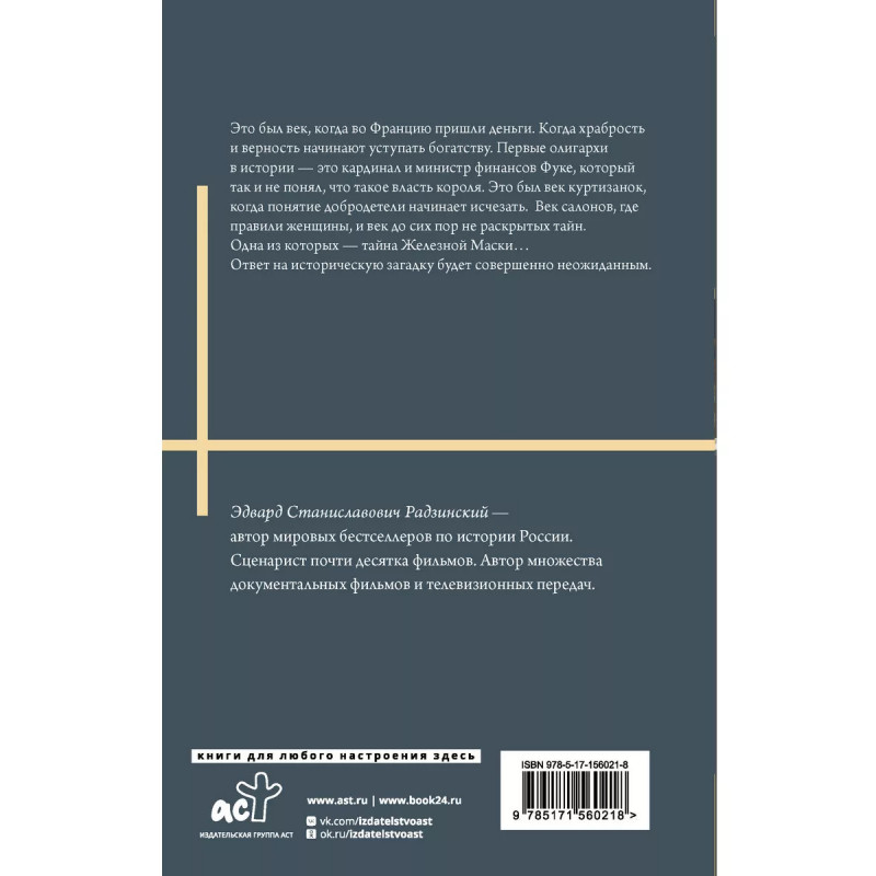 Это был век, когда во Францию пришли деньги. Когда храбрость и верность начинают уступать богатству. Первые олигархи в истории - это кардинал и министр финансов Фуке, который так и не понял, что такой власть короля. Это был век куртизанок, когда понятие добродетели начинает исчезать. Век салонов, где правили женщины, и век до сих пор не раскрытых тайн. Одна из которых - тайна Железной Маски Ответ на историческую загадку будет совершенно неожиданным.