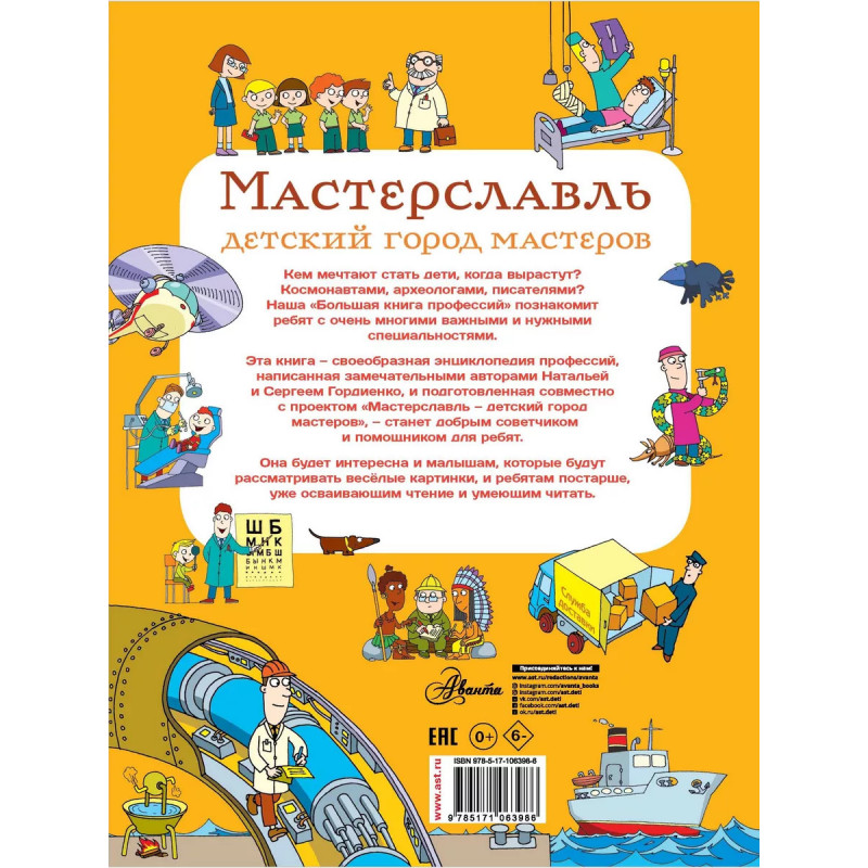 Добро пожаловать в увлекательное путешествие по миру профессий! Яркая энциклопедия с забавными картинками от Детского города мастеров и редакции Аванта поможет ребенку понять, как устроены разные профессии и какими качествами надо обладать, чтобы достичь успеха в той или иной области. Врач, спасатель, строитель, художник, учёный Везде есть свои тонкости!