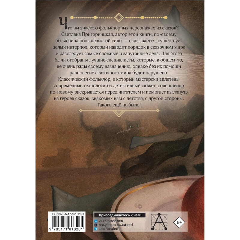 Что вы знаете о фольклорных персонажах из сказок? Светлана Пригорницкая, автор этой книги, по-своему объяснила роль нечистой силы оказывается, существует целый интерпол, который наводит порядок в сказочном мире и расследует самые сложные и запутанные дела. Для этого были отобраны лучшие специалисты, которые, в общем-то, не очень рады своему назначению, однако без их помощи равновесие сказочного мира будет нарушено. Классический фольклор, в который мастерски вплетены современные технологии и детективный сюжет, совершенно по-новому раскрывается перед читателем и помогает взглянуть на героев сказок, знакомых нам с детства, с другой стороны. Такого ещё не было!
