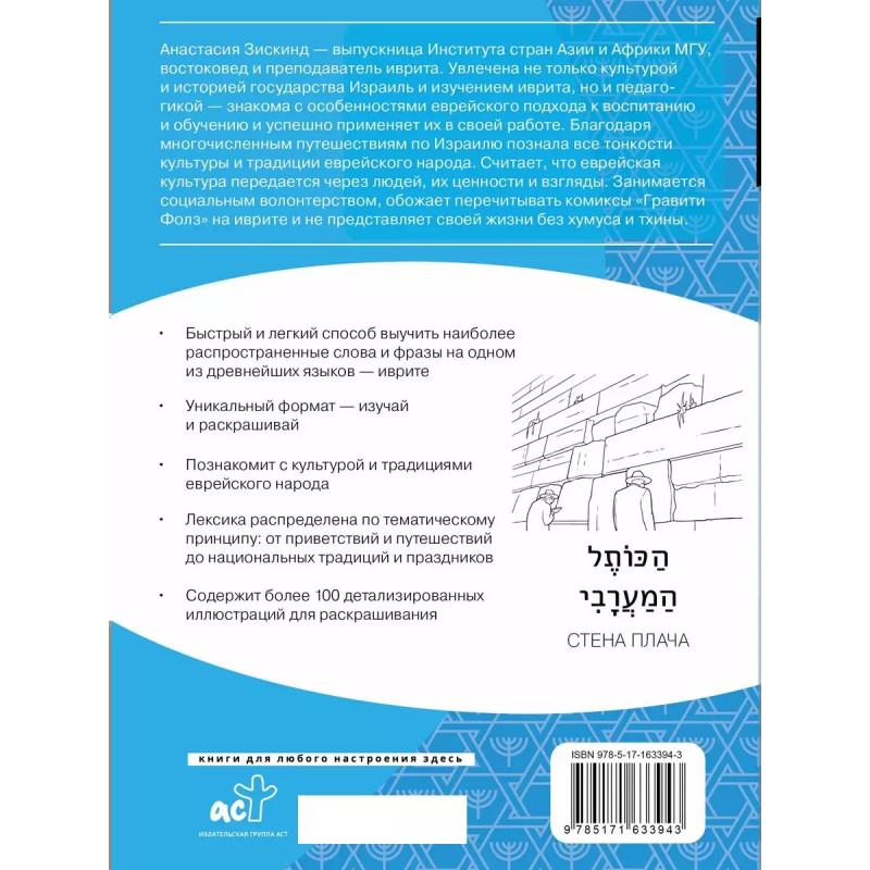 Анастасия Зискинд выпускница Института стран Азии и Африки МГУ, востоковед и преподаватель иврита. Увлечена не только культурой и историей государства Израиль и изучением иврита, но и педагогикой знакома с особенностями еврейского подхода к воспитанию и обучению и успешно применяет их в своей работе. Благодаря путешествиям по Израилю познала все тонкости культуры и традиции еврейского народа. Считает, что еврейская культура передается через людей, их ценности и взгляды. Занимается социальным волонтерством, обожает перечитывать комиксы "Гравити Фолз" на иврите и не представляет своей жизни без хумуса и тхины. Быстрый и легкий способ выучить наиболее распространенные слова и фразы на одном из древнейших языков иврите Уникальный формат изучай и раскрашивай Познакомит с культурой и традициями еврейского народа Лексика распределена по тематическому принципу: от приветствий и путешествий до национальных традиций и праздников Содержит более 100 детализированных иллюстраций для раскрашивания.