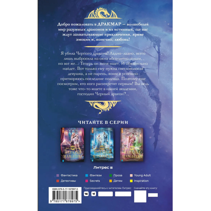 - Шестая книга цикла Дракмар. - Необычный ретеллинг Спящей красавицы в декорациях волшебной академии. - Красивая зимняя сказка об истинной паре, которой пришлось через многое пройти ради счастья. - Наталья Мамлеева топовый автор Литреса. - Серия Дракмар. Фэнтези-миры Натальи Мамлеевой.