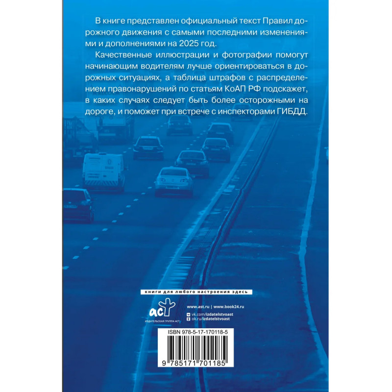 В книге представлен официальный текст Правил дорожного движения с самыми последними изменениями и дополнениями на 2025 год. Качественные иллюстрации и фотографии помогут начинающим водителям лучше ориентироваться в дорожных ситуациях, а таблица штрафов с распределением правонарушений по статьям КоАП РФ подскажет, в каких случаях следует быть более осторожными на дороге, и поможет при встрече с инспекторами ГИБДД. Издание учитывает все изменения, опубликованные в официальных источниках на момент подписания издания в печать.