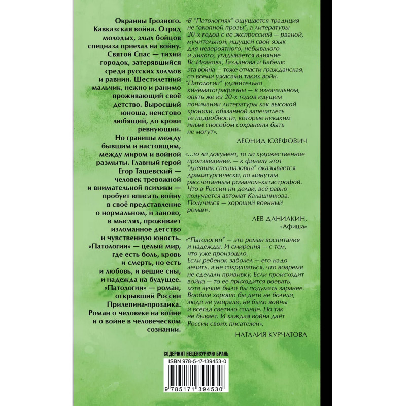 Окраины Грозного. Кавказская война. Отряд молодых, злых бойцов спецназа приехал на войну. Святой Спас тихий городок, затерявшийся среди русских холмов и равнин. Шестилетний мальчик, нежно и ранимо проживающий своё детство. Выросший юноша, неистово любящий, до крови ревнующий. Но границы между бывшим и настоящим, между миром и войной размыты. Главный герой Егор Ташевский человек тревожной и внимательной психики пробует вписать войну в своё представление о нормальном, и заново, в мыслях, проживает изломанное детство и чувственную юность. "Патологии" целый мир, где есть боль, кровь и смерть, но есть и любовь, и вещие сны, и надежда на будущее. "Патологии" роман, открывший России Прилепина-прозаика. Роман о человеке на войне и о войне в человеческом сознании. "В Патологиях ощущается традиция не окопной прозы, а литературы 20-х годов с ее экспрессией рваной, мучительной, ищущей свой язык для невероятного, небывалого и дикого;