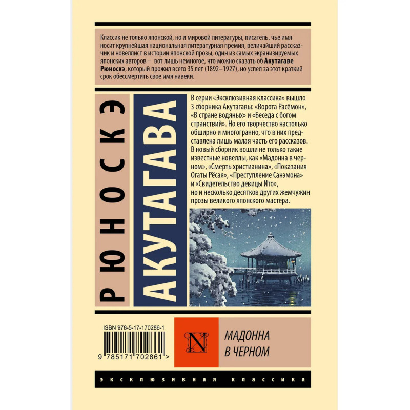В серии "Эксклюзивная классика" вышло 3 сборника Акутагавы: "Ворота Расёмон", "В стране водяных" и "Беседа с богом странствий". Но его творчество настолько обширно и многогранно, что в них представлена лишь малая часть его рассказов. В новый сборник вошли не только такие известные новеллы, как "Мадонна в черном", "Смерть христианина", "Показания Огаты Рёсая", "Преступление Санэмона" и "Свидетельство девицы Ито", но и несколько десятков других жемчужин прозы великого японского мастера.