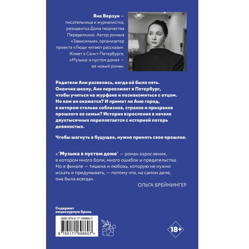 Яна Верзун писательница и журналистка, резидентка Дома творчества Переделкино. Автор романа "Зависимые", организатор проекта "Люди читают рассказы". Живет в Санкт-Петербурге. "Музыка в пустом доме" ее новый роман. Родители Ани развелись, когда ей было пять. Окончив школу, Аня переезжает в Петербург, чтобы учиться на журфаке и познакомиться с отцом. Но кем он окажется? И примет ли Аню город, в котором столько соблазнов, страхов и призраков прошлого ее семьи? История взросления в начале двухтысячных переплетается с историей потерь девяностых. Чтобы шагнуть в будущее, нужно принять свое прошлое. "Музыка в пустом доме роман взросления, в котором много боли, много ошибок и предательства. Но в финале тишина и любовь, которую не нужно искать и придумывать, потому что, на самом деле, она была всегда". Ольга Брейнингер