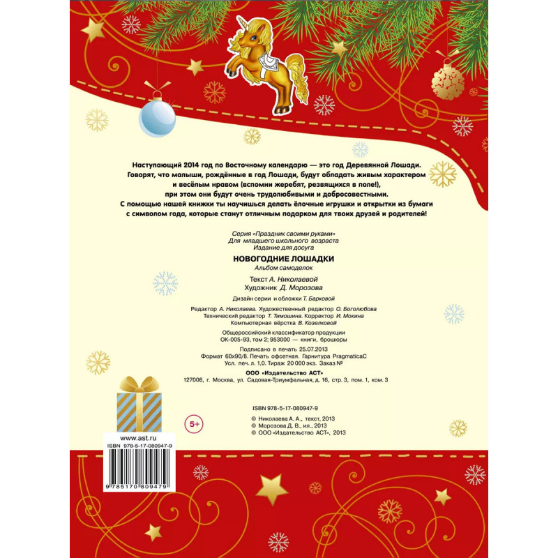 Новогодние лошадки. Наступающий 201 год по Восточному календарю - это год Деревянной Лошади. Говорят, что малыши, рождённые в год Лошади, будут обладать живым характером и весёлым нравом (вспомним жеребят, резвящихся в поле!), при этом они будут очень трудолюбивыми и добросовестными. С помощью нашей книжки ты научишься делать ёлочные игрушки и открытки из бумаги с символом года, которые станут отличным подарком для твоих друзей и родителей!