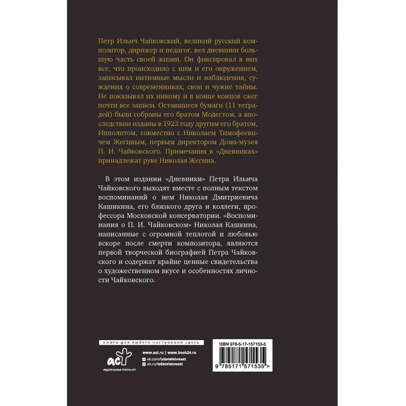 В этом издании "Дневники" Петра Ильича Чайковского выходят вместе с полным текстом воспоминаний о нем , его близкого друга и коллеги, профессора Московской консерватории. "Воспоминания о П. И. Чайковском" Николая Кашкина, написанные с огромной теплотой и любовью вскоре после смерти композитора, являются первой творческой биографией Петра Чайковского и содержат крайне ценные свидетельства о художественном вкусе и особенностях личности Чайковского.