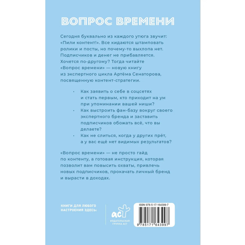 Сегодня буквально из каждого утюга звучит: "Пили контент!" Все кидаются штамповать ролики и посты, но почему-то выхлопа нет. Подписчиков и денег не прибавляется. Хочется по-другому? Тогда читайте "Вопрос времени" новую книгу из экспертного цикла Артёма Сенаторова, посвященную контентстратегии. Как заявить о себе в соцсетях и стать первым, кто приходит на ум при упоминании вашей ниши? Как выстроить фан-базу вокруг своего экспертного бренда и заставить подписчиков обожать всё, что вы делаете? Как не слиться, когда у других прёт, а у вас ещё нет видимых результатов? "Вопрос времени" не просто гайд по контенту, но готовая инструкция, которая позволит вам повысить охваты, привлечь новых подписчиков, прокачать личный бренд и вырасти в доходах.