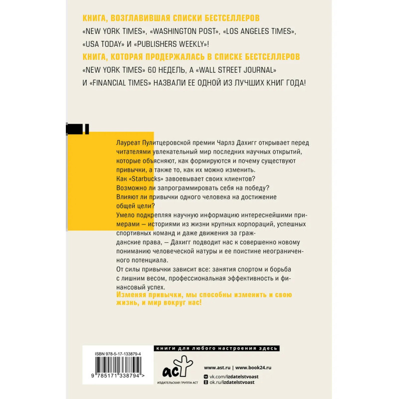 Лауреат Пулитцеровской премии Чарлз Дахигг открывает перед читателями увлекательный мир последних научных открытий, которые объясняют, как формируются и почему существуют привычки, а также то, как их можно изменить. Как "Starbucks" завоевывает своих клиентов? Возможно ли запрограммировать себя на победу? Влияют ли привычки одного человека на достижение общей цели? Умело подкрепляя научную информацию интереснейшими примерами историями из жизни крупных корпораций, успешных спортивных команд и даже движения за гражданские права, Дахигг подводит нас к совершенно новому пониманию человеческой натуры и ее поистине неограниченного потенциала. От силы привычки зависит все: занятия спортом и борьба с лишним весом, профессиональная эффективность и финансовый успех. Изменяя привычки, мы способны изменить и свою жизнь, и мир вокруг нас!