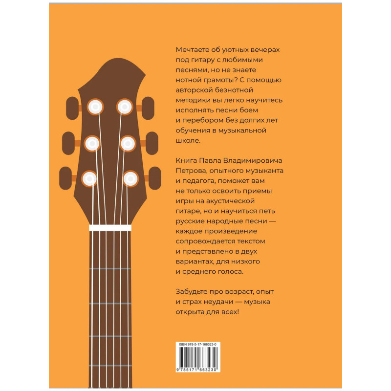 Мечтаете об уютных вечерах под гитару с любимыми песнями, но не знаете нотной грамоты? С помощью авторской безнотной методики вы легко научитесь исполнять песни боем и перебором без долгих лет обучения в музыкальной школе. Книга Павла Владимировича Петрова, опытного музыканта и педагога, поможет вам не только освоить приемы игры на акустической гитаре, но и научиться петь русские народные песни каждое произведение сопровождается текстом и представлено в двух вариантах, для низкого и среднего голоса. Забудьте про возраст, опыт и страх неудачи музыка открыта для всех!