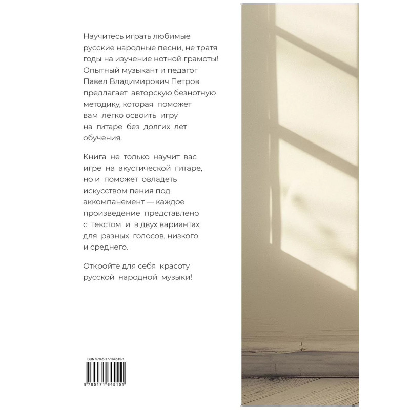 Научитесь играть любимые русские народные песни, не тратя годы на изучение нотной грамоты! Опытный музыкант и педагог Павел Владимирович Петров предлагает авторскую безнотную методику, которая поможет вам легко освоить игру на гитаре без долгих лет обучения. Книга не только научит вас игре на акустической гитаре, но и поможет овладеть искусством пения под аккомпанемент каждое произведение представлено с текстом и в двух вариантах для разных голосов, низкого и среднего. Откройте для себя красоту русской народной музыки!