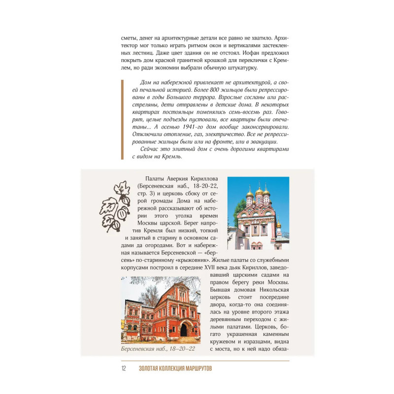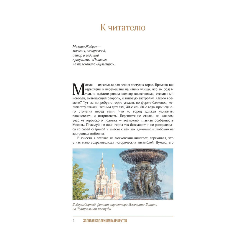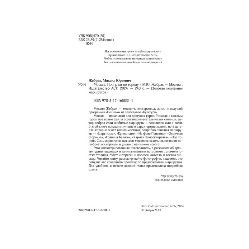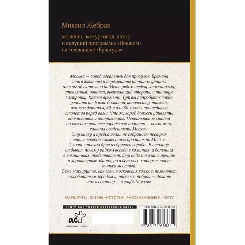 Михаил Жебрак москвич, экскурсовод, автор и ведущий программы "Пешком" на телеканале "Культура". Москва город идеальный для прогулок. Узнавая с каждым годом все новые факты о достопримечательностях столицы, автор собрал свои любимые маршруты и поделился ими с вами. В этой книге показаны лучшие и характерные здания, но в деталях, которые знает только местный, подробно описаны маршруты "Царь горы", "Купец идет", "На фоне Пушкина", "Опричная сторонка", "Граница Белого", "Карман Замоскворечья", "Под горой". Семь маршрутов, как семь московских холмов, позволят полюбоваться городом и узнать о нем много нового. Этот иллюстрированный путеводитель, с рассказом об архитектурных шедеврах и занимательными историями о знаменитостях столицы, будет интересен и полезен жителям и гостям Москвы. Читайте книгу, рассматривайте фотографии, надеемся, это побудит вас совершить прогулку по предложенным маршрутам. Для удобства, в начале каждой главы представлена подробная схема.