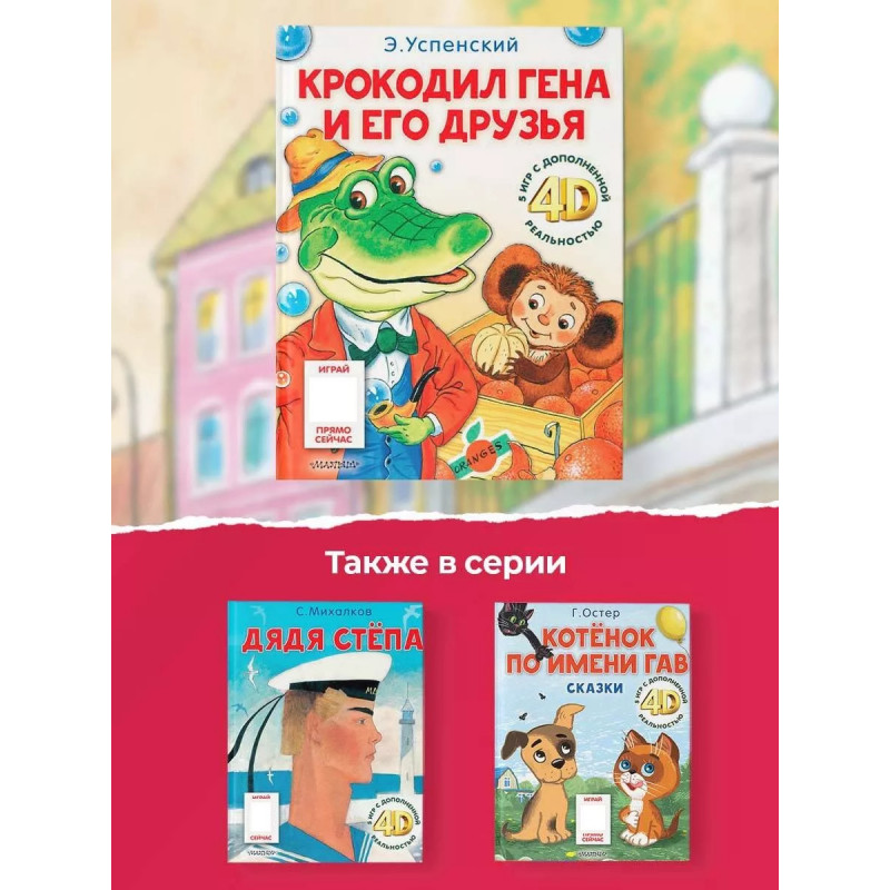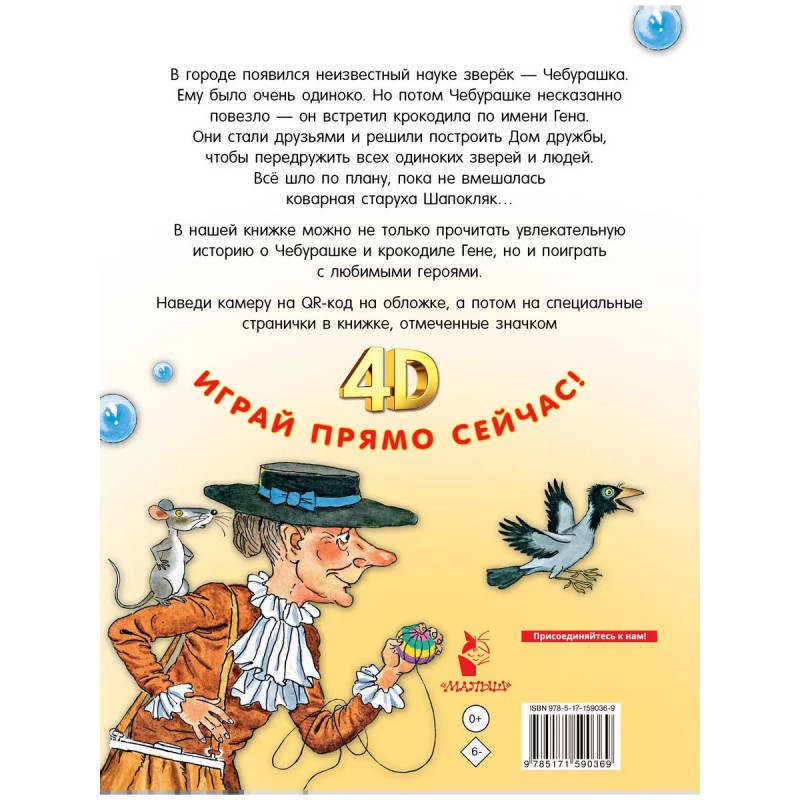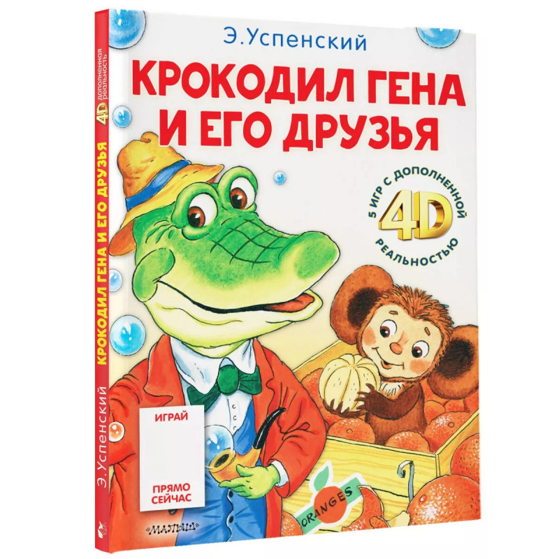 Крокодил Гена и его друзья. Сказка + 5 игр 4D. Странным существам, которые привыкли питаться апельсинами, очень одиноко в этом холодном мире. Так было и с Чебурашкой. Ему повезло - он встретил крокодила по имени Гена. Они стали друзьями и решили построить Дом дружбы, чтобы передружить всех одиноких зверей и людей. Всё шло по плану, пока не вмешалась коварная старуха Шапокляк В нашей книжке можно не только прочитать увлекательную историю о Чебурашке и крокодиле Гене, но и поиграть с любимыми героями. Волшебство 4Д..
