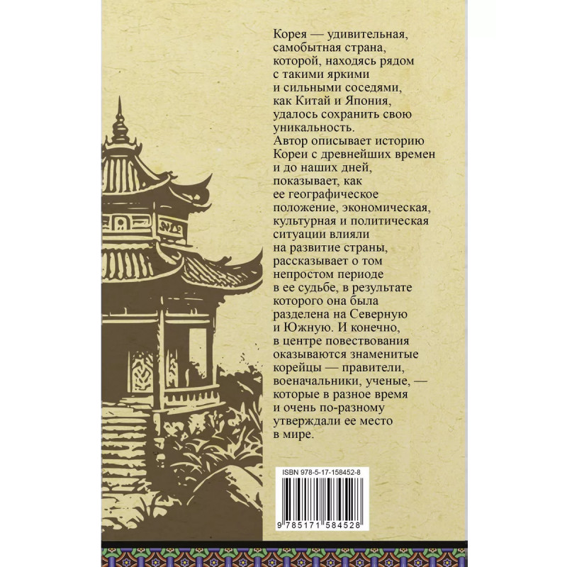 Корея. Полная история. Корея - удивительная, самобытная страна, которой, находясь рядом с такими яркими и сильными соседями, как Китай и Япония, удалось сохранить свою уникальность. Автор описывает историю Кореи с древнейших времен и до наших дней, показывает, как ее географическое положение, экономическая, культурная и политическая ситуации влияли на развитие страны, рассказывает о том непростом периоде в ее судьбе, в результате которого она была разделена на Северную и Южную. И конечно, в центре повествования оказываются знаменитые корейцы - правители, военачальники, ученые, - которые в разное время и очень по-разному утверждали ее место в мире.