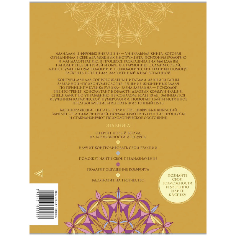 "Мандалы цифровых вибраций" уникальная книга, которая объединила в себе два мощных инструмента: психонумерологию и мандалотерапию. В процессе раскрашивания мандал вы наполнитесь энергией и обретете гармонию с самим собой, а инструменты нумерологии и психологические техники помогут раскрыть потенциал, заложенный в нас Вселенной. Контуры мандал сопровождены цитатами из книги Елены Забелиной "Психонумерология. Решение жизненных задач по принципу кубика Рубика". Елена Забелина психолог, бизнес-тренер, консультант в области деловых коммуникаций, специалист по управлению персоналом; более 10 лет занимается изучением кармической нумерологии, помогает найти истинное предназначение и выбрать жизненный путь. Вдохновляющие цитаты о таинстве цифровых вибраций зарядят организм энергией, нормализуют внутренние процессы и стабилизируют психологическое состояние.