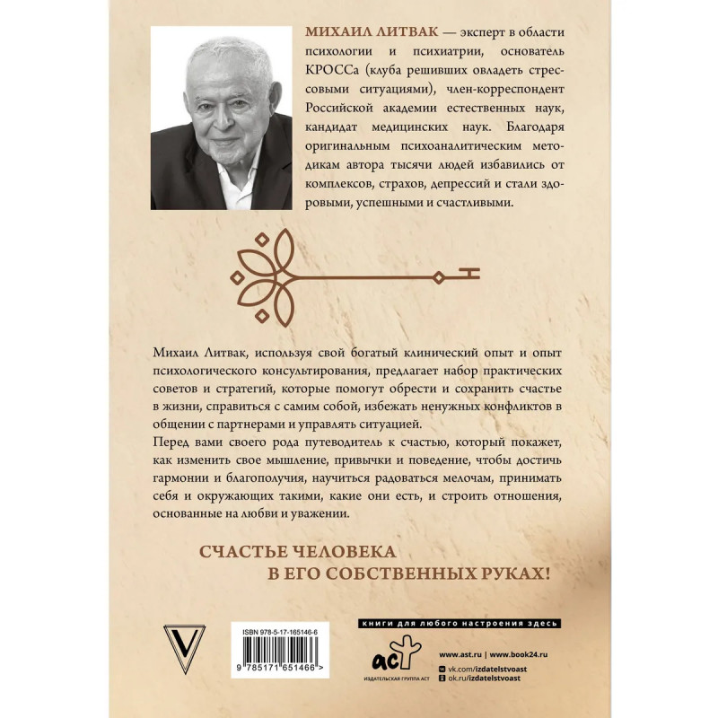 Михаил Литвак эксперт в области психологии и психиатрии, основатель КРОССа (клуба решивших овладеть стрессовыми ситуациями), член-корреспондент Российской академии естественных наук, кандидат медицинских наук. Благодаря оригинальным психоаналитическим методикам автора тысячи людей избавились от комплексов, страхов, депрессий и стали здоровыми, успешными и счастливыми. Михаил Литвак, используя свой богатый клинический опыт и опыт психологического консультирования, предлагает набор практических советов и стратегий, которые помогут обрести и сохранить счастье в жизни, справиться с самим собой, избежать ненужных конфликтов в общении с партнерами и управлять ситуацией. Перед вами своего рода путеводитель к счастью, который покажет, как изменить свое мышление, привычки и поведение, чтобы достичь гармонии и благополучия, научиться радоваться мелочам, принимать себя и окружающих такими, какие они есть, и строить отношения, основанные на любви и уважении. Счастье человека в его собственных руках!