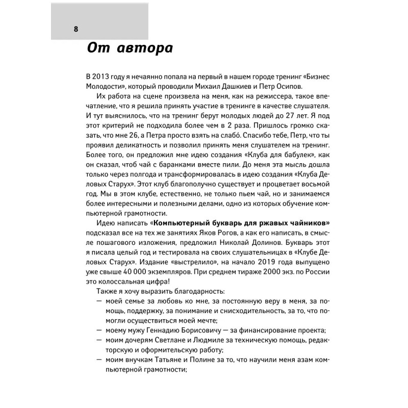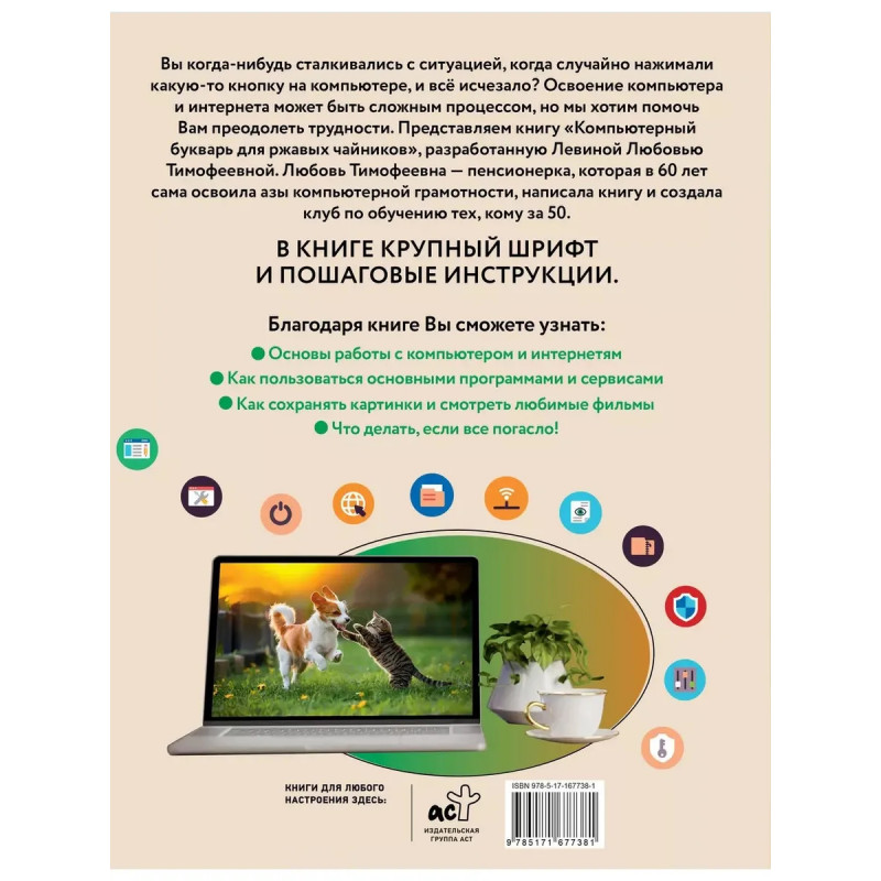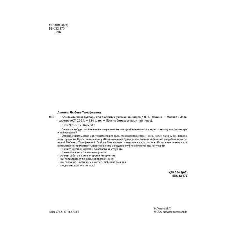 Вы когда-нибудь сталкивались с ситуацией, когда случайно нажимали какую-то кнопку на компьютере, и всё исчезало? Освоение компьютера и интернета может быть сложным процессом, но мы хотим помочь Вам преодолеть трудности. Представляем книгу "Компьютерный букварь для ржавых чайников", разработанную Левиной Любовью Тимофеевной. Любовь Тимофеевна пенсионерка, которая в 60 лет сама освоила азы компьютерной грамотности, написала книгу и создала клуб по обучению тех, кому за 50. В КНИГЕ КРУПНЫЙ ШРИФТ И ПОШАГОВЫЕ ИНСТРУКЦИИ. Благодаря книге Вы сможете узнать: Основы работы с компьютером и интернетом Как пользоваться основными программами и сервисами Как сохранять картинки и смотреть любимые фильмы Что делать, если все погасло!