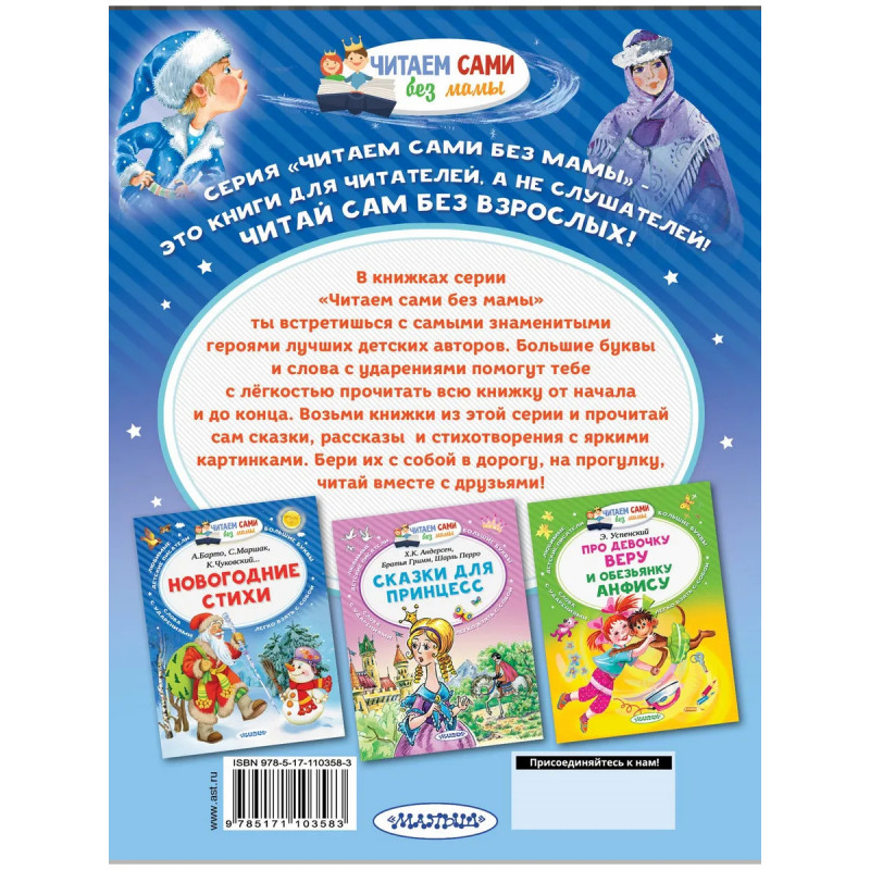 В книжках серии Читаем сами без мамы ты встретишься с самыми знаменитыми героями лучших детских авторов. Большие буквы и слова с ударениями помогут тебе с лёгкостью прочитать всю книжку от начала и до конца. Возьми книжки из этой серии и прочитай сам сказки, рассказы и стихотворения с яркими картинками. Бери их с собой в дорогу, на прогулку, читай вместе с друзьями! Серия Читаем сами без мамы - это книги для читателей, а не для слушателей! Читай сам, без взрослых!