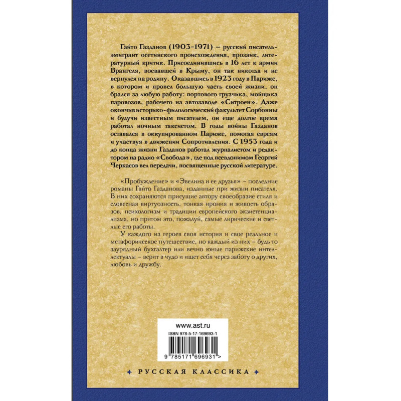Гайто Газданов выдающийся русский писатель-прозаик и литературный критик XX века. Все свои произведения он создал уже в эмиграции, и на родине его имя долгое время оставалось неизвестным признание в России пришло к Газданову уже после смерти, российские читатели открыли книги автора только в начале девяностых годов. Газданов прежде всего известен по романам Вечер у Клэр, Ночные дороги и Возвращение Будды. Роман Вечер у Клэр высоко оценили Бунин и Горький. Критики особо отмечали невероятное чувство слова и ритма, завораживающую магию рассказчика, тонкую иронию и лирическое изображение окружающей действительности. В этот сборник вошли два поздних романа автора Пробуждение и Эвелина и ее друзья.