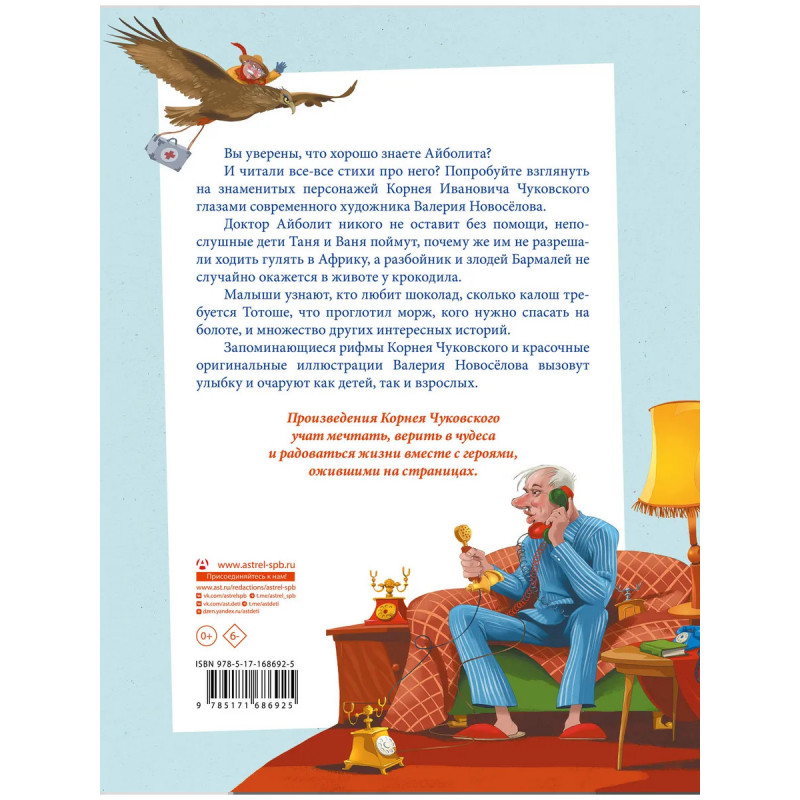 Уникальное сочетание поэзии, юмора и глубокого смысла делает творчество Корнея Чуковского актуальным и любимым на протяжении многих поколений. Современные яркие, забавные и запоминающиеся иллюстрации Валерия Новосёлова. Новый взгляд на известных персонажей. Идеальный подарок.