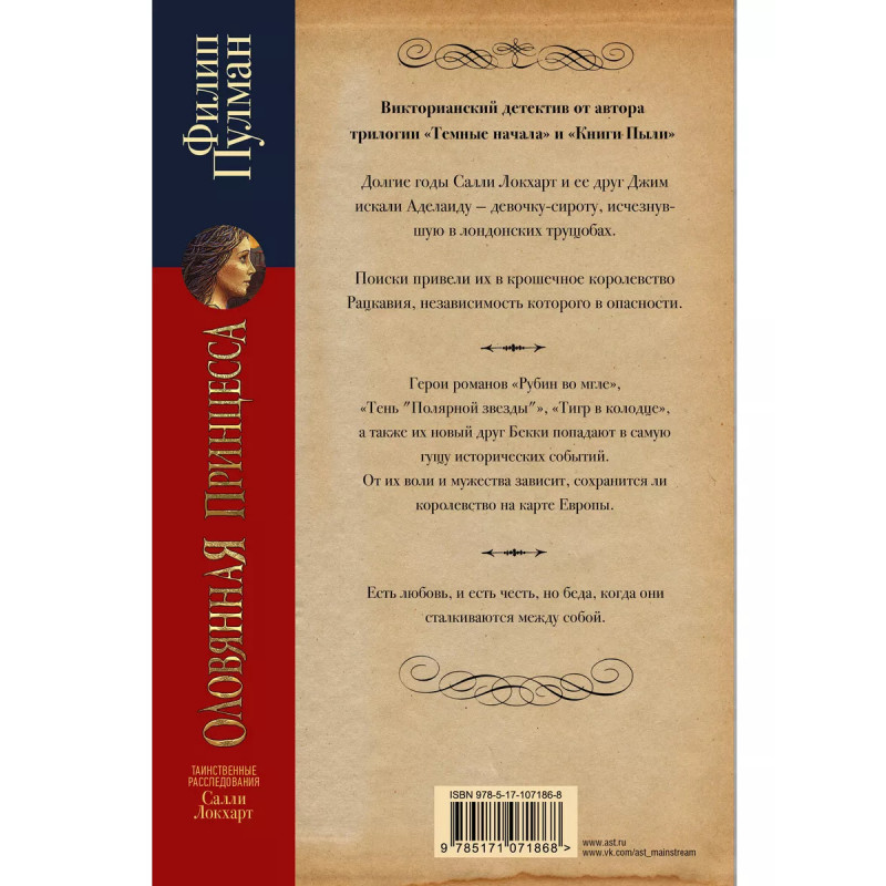 Таинственные расследования Салли Локхарт. Оловянная принцесса. Долгие годы Салли Локхарт и ее друг Джим искали Аделаиду - девочку-сироту, чей след исчез в лондонских трущобах. Поиски привели их в крошечное королевство Рацкавия, независимость которого в опасности. Герои романов "Рубин во мгле", "Тень Полярной звезды", "Тигр в колодце", а также их новый друг Бекки попадают в самую гущу исторических событий. От их воли и мужества зависит, останется ли королевство на карте Европы.