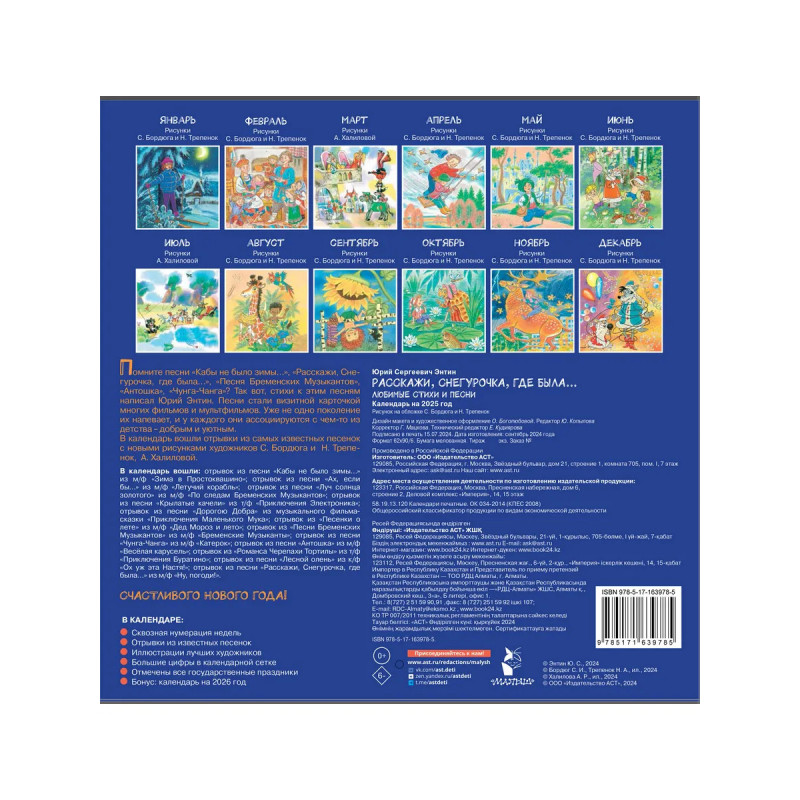 Знаете ли вы песенки Расскажи, Снегурочка, где была, Кабы не было зимы, Вот оно какое, наше лето..., Ничего на свете лучше нету? Так вот слова к этим песенкам написал поэт, сценарист и драматург Юрий Энтин. Песни звучат в полюбившихся многим мультфильмах Ну, погоди!, Зима в Простоквашино, Дед Мороз и лето, Бременские музыканты, Летучий корабль и многих других. Знакомые с детства, тексты этих песенок вошли в наш календарь. Рисунки С. Бордюга и Н. Трепенок, А. Халиловой.