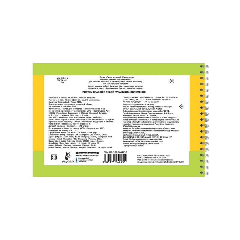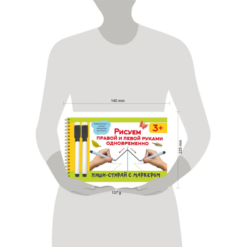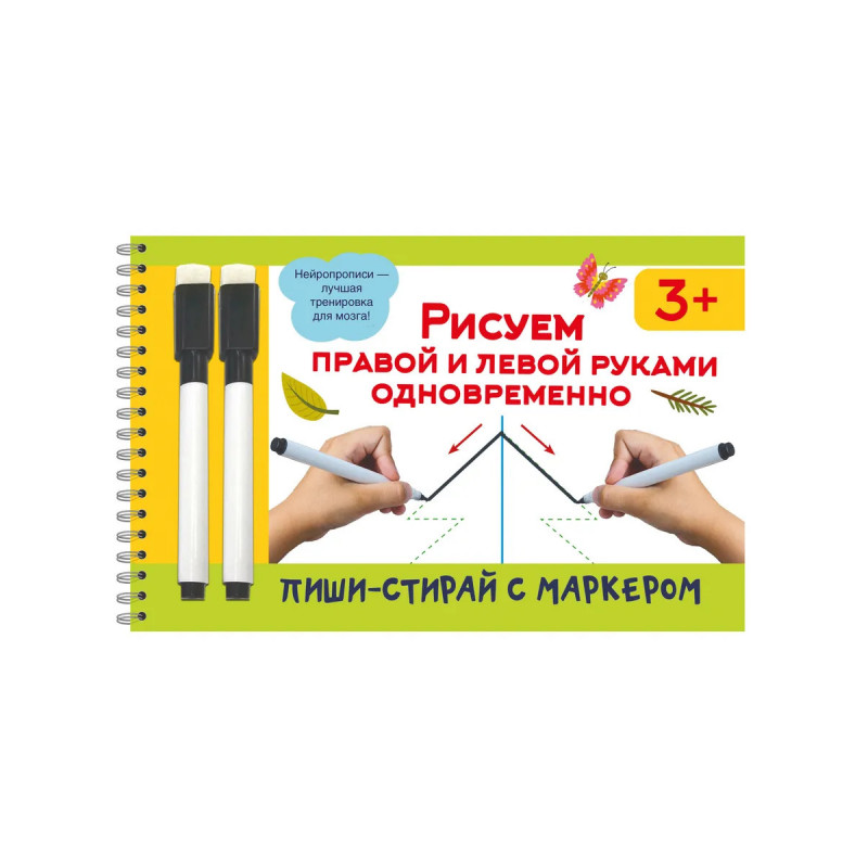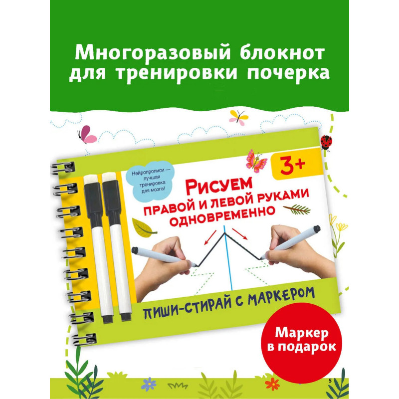"Рисуем правой и левой руками одновременно" удобный и полезный многоразовый рабочий блокнот, в котором можно писать, рисовать и стирать хоть 100 раз! Плотная мелованная бумага и глянцевые ламинированные страницы делают книгу не только привлекательной, но и долговечной. В комплекте 2 маркера на водной основе. В книге собраны занимательные задания, цель которых наладить согласованное взаимодействие правого и левого полушарий мозга, благодаря чему ребёнок станет более внимательным и усидчивым, улучшит свою память, речь, мелкую моторику и координацию движений. Книгу можно использовать дома, на занятиях в детском саду и даже в дороге.Для дошкольного возраста.