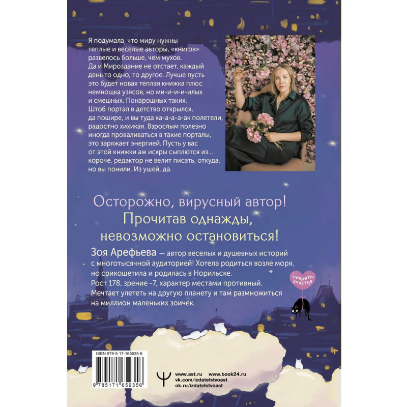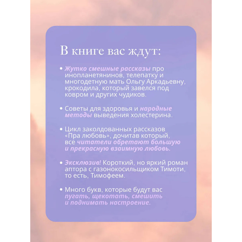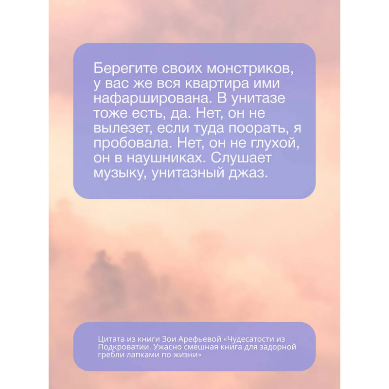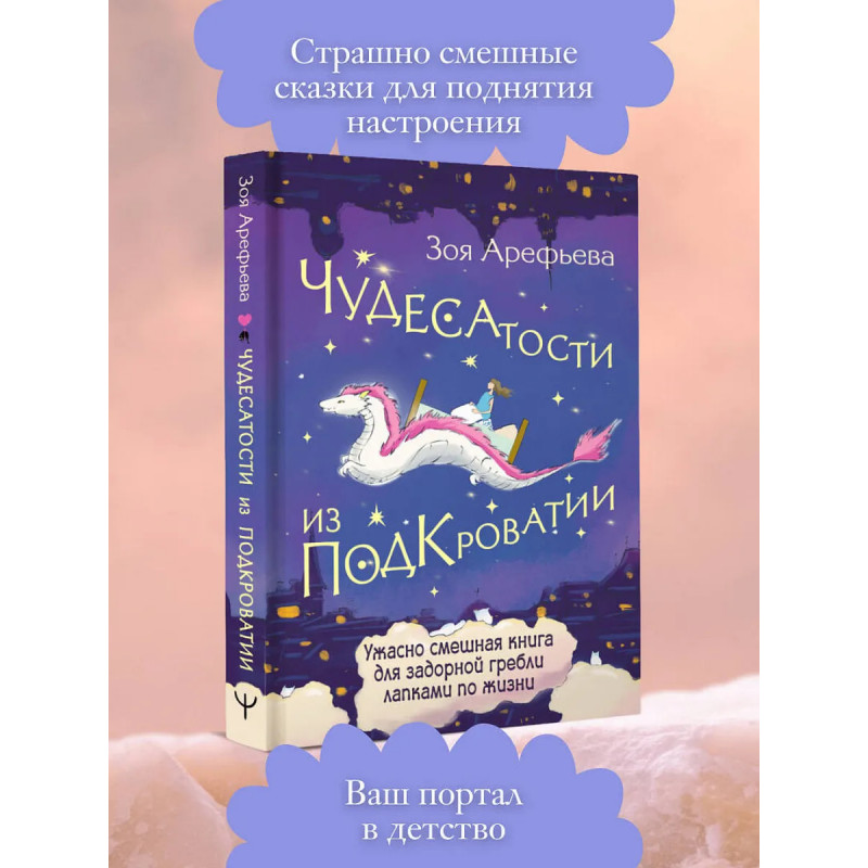 По прогнозу циклон Грусть и осадки в виде слезопада. (Если вы в другом регионе, запасайтесь солнцезащитным кремом будет жарко!) Самое время перенестись в беззаботное детство и пополнить запасы энергии, чтобы противостоять непогоде. Нельзя? Еще как можно!Лифт в детство отправляется через 3, 2, 1 Скорее открывай эту книгу, чтобы успеть! Она будет и пугать, и смешить, и щекотать буковками. В чудесном мире Подкроватии ты познакомишься с домашними и дикими пугачками, с семьей волшебников, женщинами-телепатками и другими чудиками, и отдохнешь по полной!Теплая, как солнышко, веселая, как воздушный шарик, открывай ее всякий раз, когда нужно пополнить запасы вдохновения, душевного уюта и хорошего настроения. Можно читать ее каждый день, чтобы укрепить иммунитет к грустинкам, печалькам и пугалкам.Новая книга блюбимого аптора Зои Арефьевой как чудесный базар: в ней найдешь и вдохновение, и мотивацию, и гармонию, и хорошее настроение, чтобы дальше грести лапками по жизни. Готов? Тогда открывай!