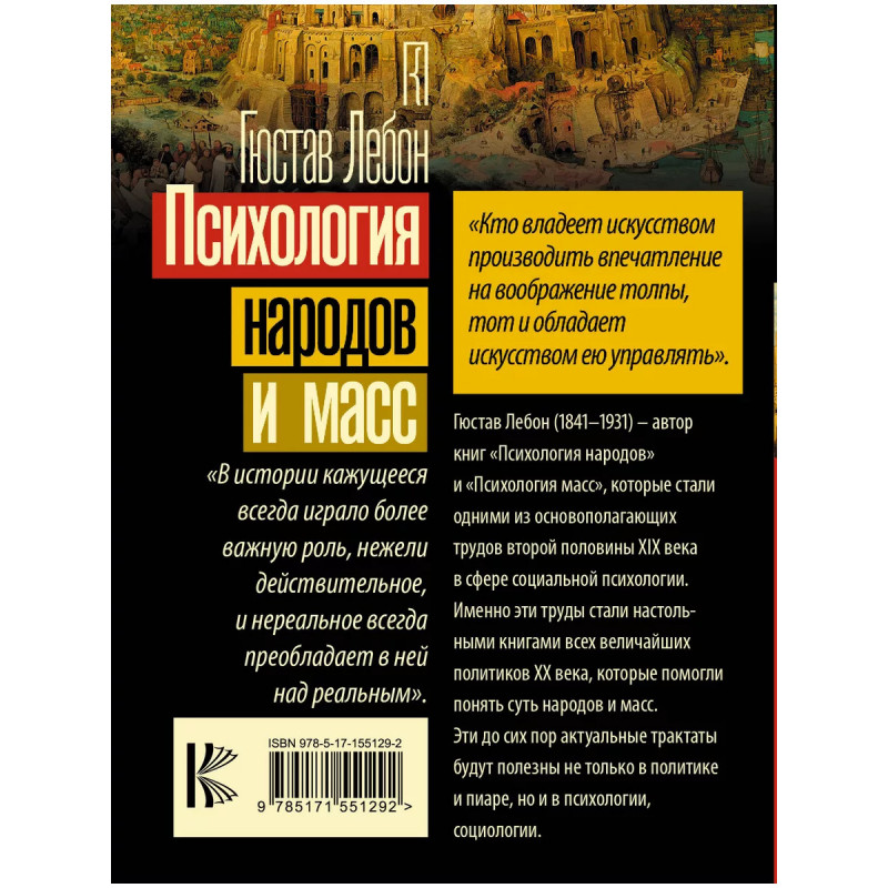 Психология народов и масс. "Кто владеет искусством производить впечатление на воображение толпы, тот и обладает искусством ею управлять". Гюстав Лебон (1841-1931) - автор книг "Психология народов" и "Психология масс", которые стали одними из основополагающих трудов второй половины XIX века в сфере социальной психологии. Именно эти труды стали настольными книгами всех величайших политиков XX века, которые помогли понять суть народов и масс. Эти до сих пор актуальные трактаты будут полезны не только в политике и пиаре, но и в психологи, социологии. "В истории кажущееся всегда играло более важную роль, нежели действительное, и нереальное всегда преобладает в ней над реальным".