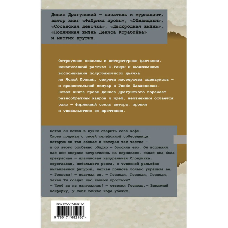 Денис Драгунский писатель и журналист, автор книг Фабрика прозы, Обманщики, Соседская девочка, Двоюродная жизнь, Подлинная жизнь Дениса Кораблёва и многих других. Остроумные новеллы и литературные фантазии, ненаписанный рассказ О.Генри и вымышленные воспоминания полуграмотного дьячка из Ясной Поляны, секреты мастерства сценариста и пронзительный мемуар о Глебе Павловском Новая книга прозы Дениса Драгунского поражает разнообразием жанров и идей, неизменным остается одно фирменный стиль автора, ирония и удовольствие от прочтения.